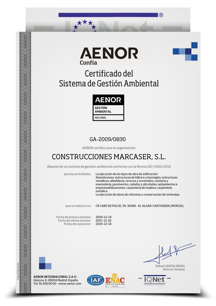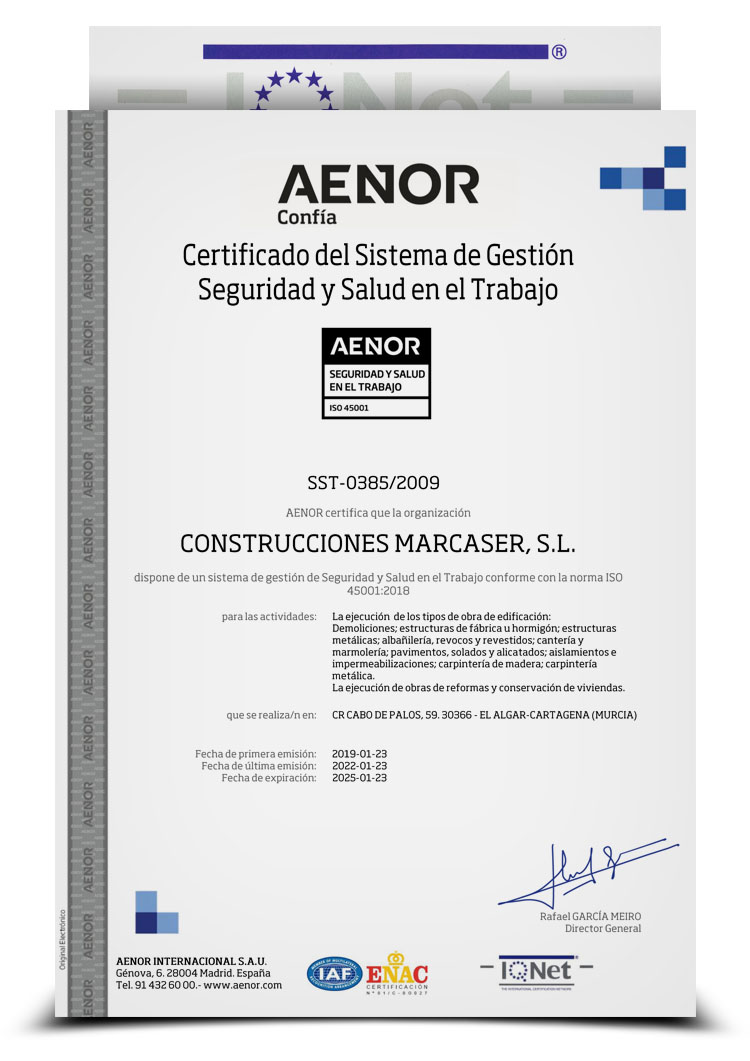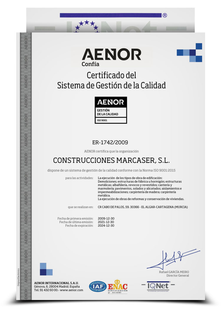 La Dirección de CONSTRUCCIONES MARCASER mantiene el compromiso permanente con la calidad, la seguridad y el medio ambiente; y siempre en el marco de su política de mejora continua, se compromete a facilitar los medios necesarios para mejorar la eficacia de su Sistema de Gestión a través de los siguientes principios:
